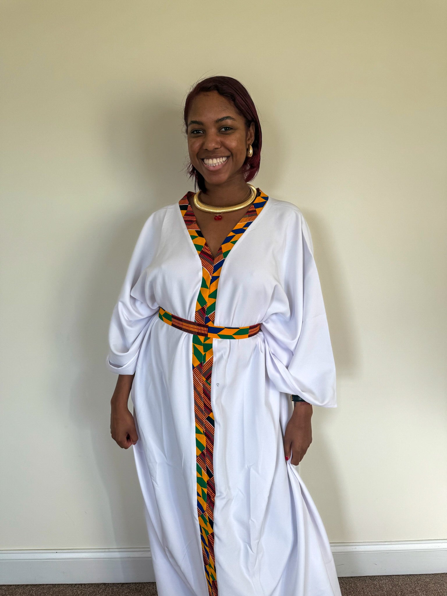 Handmade by highly skilled tailors in Africa, the silky crepe fabric drapes beautifully for an elegant, yet comfortable, look. The full-length kente trim adds a touch of cultural richness while elongating the silhouette.